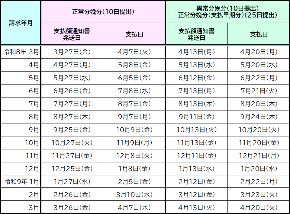 - 出産後退院した日の属する月の翌月10日までに到達するよう提出する。ただし、退院した日の属する月の10日までに専用請求書を作成できるときは、退院した日の属する月の10日までに到達するよう提出することができる。